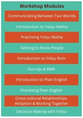 We also offer a 5-module tailored workshop package, over 6-7 hours. Content and session length can be tailored for these, too. (Please note only our full workshop satisfies Northern Territory Government training requirements for staff working with Yolŋu or on Yolŋu Country.)